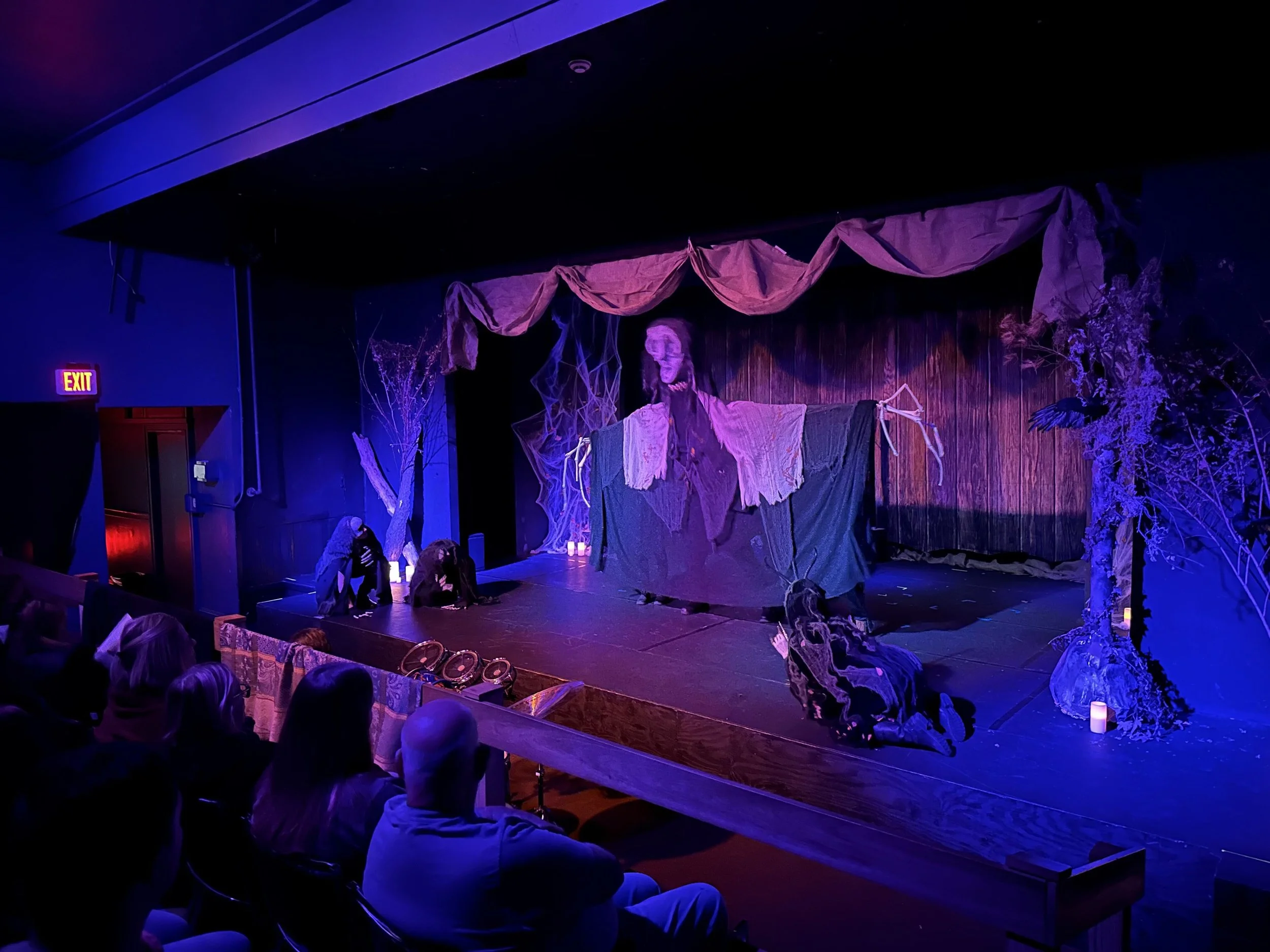 Pigeon Productions’ favorite creation was a 15’ puppet of Hecate, the goddess of witchcraft, operated by four members of the Macbeth cast in Sine Timore’s 2024 production.
